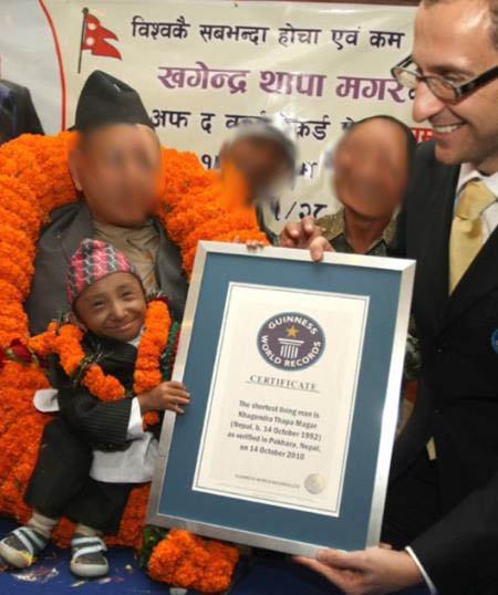 世界 “指尖巨人” 卡根德拉・塔帕・马加尔:小头里的生命之光 在尼泊尔 Baglung 地区的一座山间村落里,27 岁的卡根德拉・塔帕・马加尔(Khagendra Thapa Magar)坐在特制的木椅上,正用指尖翻动着一本巴掌大的尼泊尔语诗集。他的头围仅 31 厘米,不足普通新生儿的平均水平,被吉尼斯世界纪录认证为 “世界上头最小的成年人”。这个身高仅 67.08 厘米、体重 9 公斤的尼泊尔青年,用仿佛童话里走出来的身躯,在群山环绕的土地上书写了一段关于坚韧与热爱的生命传奇,让世人明白:生命的光芒,从不被头颅的尺寸所遮挡。 一、喜马拉雅山下的 “奇迹婴儿” 1992 年 10 月 14 日,卡根德拉出生在尼泊尔西部喜马拉雅山脉南麓的一个农民家庭。母亲德维回忆,他出生时 “像一只刚破壳的小鸟”,体重仅 0.6 公斤,头小得能被父亲的手掌完全包裹,医生诊断为 “原发性侏儒症合并小头畸形”—— 一种因基因缺陷导致全身发育受限的罕见疾病,在尼泊尔山区的发病率不足千万分之一。 “村里的萨满说他是‘山神的使者’,也有人说他活不过满月,” 父亲鲁德拉说。在医疗条件匮乏的山区,卡根德拉的生存本身就是一场奇迹:母亲用滴管给他喂山羊奶,父亲用羊毛给他缝制迷你襁褓,全家人轮流守在他身边,抵御山间的寒风与疾病。 与凡尔纳・泰勒不同,卡根德拉的生长发育几乎停滞在婴儿期:1 岁时身高 30 厘米,头围 20 厘米;5 岁时才能勉强坐稳,说话含混不清,只能发出简单的音节。但他的眼睛格外明亮,总能准确捕捉到家人的情绪。“他会用小手抚摸我流泪的脸颊,” 德维说,“那一刻,我知道他什么都懂。” 8 岁那年,卡根德拉的头围增至 28 厘米,相当于普通 6 个月婴儿的大小,但他已经能蹒跚行走,还学会了用手势和简单词语表达需求。村里的孩子们起初害怕这个 “小不点”,但很快被他的笑容打动 —— 他会坐在门槛上,看着孩子们追逐打闹,时不时发出咯咯的笑声,手里还攥着一朵刚摘的野花。 二、从山村到世界:被看见的 “微小存在” 2006 年,14 岁的卡根德拉身高仅 56 厘米,头围 30 厘米。一位来到山村采风的尼泊尔记者偶然发现了他,拍下的照片在全国引起轰动。“报纸上称他为‘喜马拉雅小精灵’,” 父亲鲁德拉回忆,“每天都有陌生人翻过山来看他,有人送糖果,有人想带他去首都。” 2010 年,在尼泊尔政府和慈善机构的帮助下,卡根德拉一家前往加德满都。吉尼斯世界纪录认证官对他进行了严格测量:身高 67.08 厘米,头围 31 厘米,正式授予他 “世界上最矮的成年人” 和 “世界上头最小的成年人” 两项纪录。认证仪式上,他穿着传统的尼泊尔长袍,被总理抱在怀里,手里紧紧攥着认证证书,眼睛里闪烁着好奇的光芒。 这次认证彻底改变了卡根德拉的生活。他成了尼泊尔的 “国家名片”:出现在邮票上,参与旅游宣传片拍摄,甚至受邀参加印度电影节。在德里的红毯上,他站在身高 2.1 米的宝莱坞明星身边,仰头笑着挥手,巨大的反差感让全世界记住了这个 “小头巨人”。 “他从不害怕陌生人,” 陪伴他出行的叔叔巴哈杜尔说,“有人好奇地摸他的头,他会拍拍对方的手,递上一颗自己喜欢的杏仁糖。” 但 fame 也带来了困扰:有人质疑家人 “利用他赚钱”,有人过度关注他的身体缺陷。对此,鲁德拉回应:“我们只想让他看看山外的世界,像其他孩子一样拥有快乐。” 三、在限制中绽放的热爱 尽管身体受限,卡根德拉却拥有着惊人的生命力。他最喜欢做的事,是坐在家门口的石阶上,听村里的老人唱尼泊尔民歌,然后用自己独特的腔调哼唱。2012 年,他在慈善机构的帮助下发行了一张迷你专辑,收录了 3 首改编的山区民谣,其中《雪山的孩子》在尼泊尔电台播放后广受好评。 “他对节奏特别敏感,” 音乐老师普拉卡什说,“我用拇指琴给他伴奏,他能准确跟上节拍,小脑袋随着旋律轻轻晃动。” 除了音乐,卡根德拉还痴迷于绘画,用特制的细画笔在小纸片上勾勒雪山与寺庙,作品被当地画廊展出,收入全部捐给山区的儿童教育机构。 与凡尔纳通过知识突围不同,卡根德拉的 “破界” 更多体现在情感连接上。他在加德满都的特殊学校学习时,成了所有孩子的 “小老师”—— 教他们用手势表达友好,用微笑化解矛盾。“有个自闭症男孩从不说话,却愿意让卡根德拉牵着他的手,” 校长说,“他的存在本身就是一种治愈。” 2017 年,25 岁的卡根德拉与同村女孩加内什结婚。婚礼上,他穿着量身定制的礼服,站在垫着三层台阶的台上,与新娘交换花环。“他用攒了很久的钱,给她买了一枚银戒指,” 德维笑着说,“婚礼那天,他唱了自己写的歌,虽然吐字不清,但所有人都听哭了。” 四、平凡日常里的生命韧性 卡根德拉的日常生活充满了细微的智慧。他的家里到处是 “迷你版” 物件:缩小的木床、特制的矮脚桌、手柄加粗的勺子。妻子加内什负责照顾他的饮食起居,帮他穿衣服、梳头发,而他则会在加内什干活时,坐在旁边给她唱歌,或者用小手帮她递工具。 “他吃饭很慢,一顿饭要吃一个小时,但从不浪费一粒米,” 加内什说。由于小头畸形影响吞咽功能,他的食物需要煮得特别软烂,家人每天为他准备南瓜粥和炖豌豆,偶尔会给他吃一小块鸡肉补充营养。 与凡尔纳定期体检不同,卡根德拉很少去医院。“山里的孩子靠抵抗力活着,他也一样,” 鲁德拉说。但随着年龄增长,他的身体开始出现问题