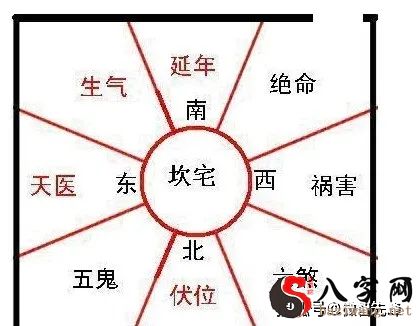 八宅派基础理论觉得,门要开益寿延年、发火、天医等吉位,好还需要朝着吉方。如下图坎宅,门能开在南方益寿延年、东南方发火吉位。不可以开在西北绝命、西方伤害、东北五鬼、大西北六煞四凶位。
