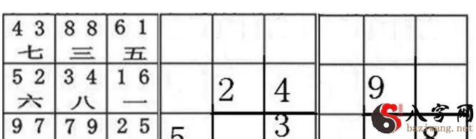 假如元运变换必须改门,门要开在纳财气的部位,要留意所上的大门的阴阳五行特点,令其旺星飞到门口,不可以在旺星飞临的宫位随便开关门。如七运壬山丙向正方向开壬门,到八运必须改门,可在未方开关门,财气到门。其飞星象图如下所示: